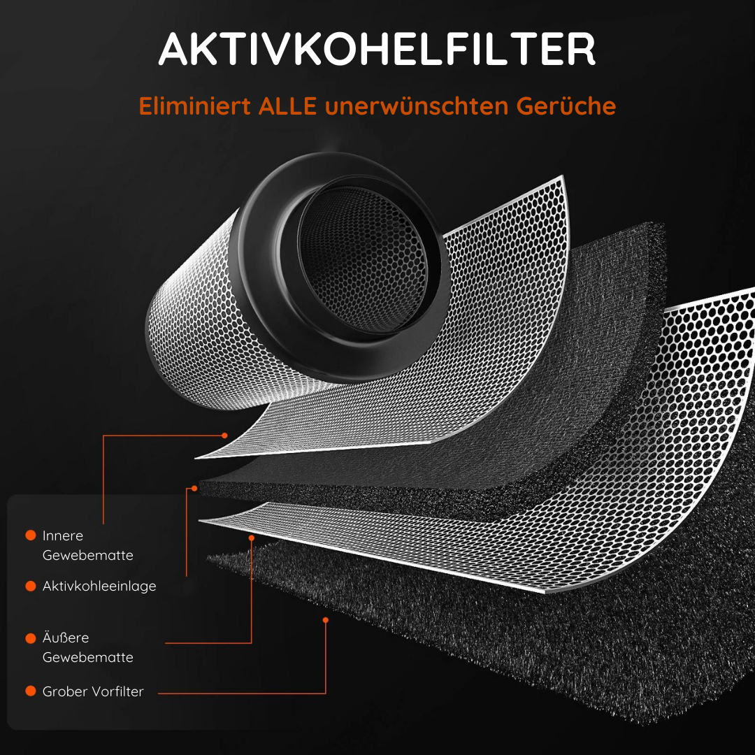 Durch unsere durchdachte Vorfiltertechnik erhöhen wir die Lebensdauer unserer Aktivkohlefilter massiv. Fremdkörper wie Insekten oder Blätter werden abgewehrt und selbst Staubpartikel gelangen nicht in den Aktivkohlefilter. Dadurch verlängert sich die Lebenszeit um ca. 50%.